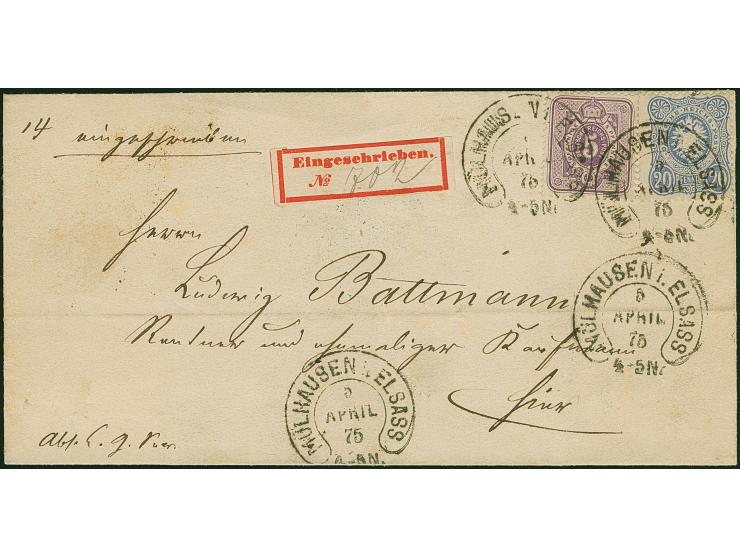 “MÜLHAUSEN i. ELSASS 6.APRIL.75” (Spalink 26-8) mehrfach klar auf 5 Pfge graupurpur and 20 Pfge dunkelultramarin als tarifgerechte Einzelfrankatur auf R-Ortsbriefhülle mit frühem R-Zettel “Eingeschrieben No.” und Ankunftsstempel, Die farbfrischen Marken sind normal gezähnt und wie die Briefhülle in einwandfreier Erhaltung, Fotobefund Petry BPP (2020)
