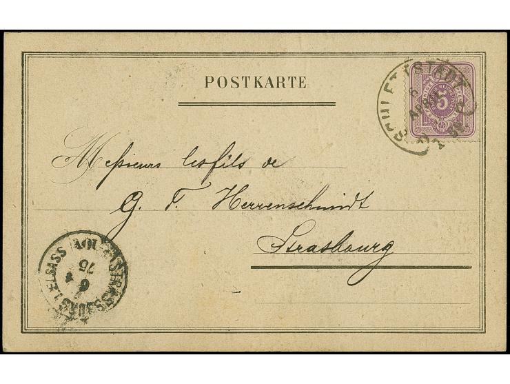 “SCHLETTSTADT 6.APRIL75” (Spalink 33) klar auf 5 Pfge violett auf privat gedruckter Firmenpostkarte nach Straßburg mit vorderseitigem Ankunftsstempel. Die farbfrische Marke ist gut gezähnt und wie die Postkarte in einwandfreier Erhaltung. Eine dekorative Verwendung aus 1875