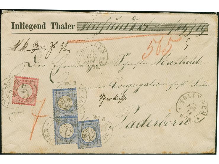 “SOLINGEN 31.AUG.72” (Spalink 34-3) mehrfach recht klar auf kleiner Schild 1 Gr. karmin sowie senkrechtem Paar und Einzelmarke 2 Sgr. grauultramarin als tarifgerechte Frankatur auf Wert-Briefkuvert über 150 Thaler mit zusätzlichem Hufeisenstempel “SOLINGEN 31.AUG.72” (Spalink 34-1) nach Paderborn mit Ausgabestempel. Die farbfrischen Marken sind sehr gut geprägt, üblich gezähnt und in einwandfreier Erhaltung, der Umschlag mit leichten Beförderungsspuren. Ein dekorativer Wertbrief mit auf Fahrpost-Sendungen sehr seltenem Hufeisenstempel, Fotoattest Krug BPP (2013)