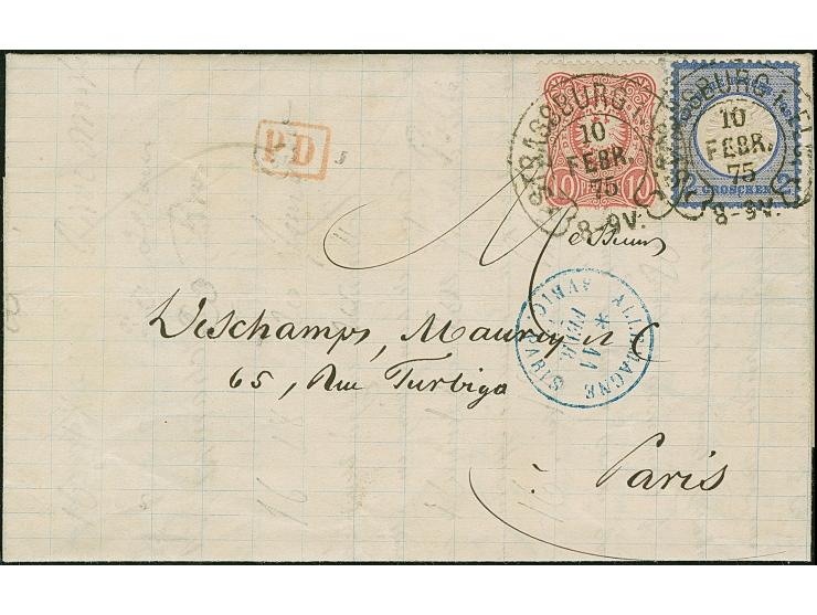 “STRASSBURG i. ELS. BHF. 10. FEBR.75” (Spalink 26-5) zweimal klar auf großer Schild 2 Gr. grauultramarin und 10 Pfge karminroa als tarifgerechte Frankatur auf komplettem Faltbrief mit rotem Ra1 “PD” und frz. Transitstempel nach Paris. Die Brustschild-Marke ist sehr gut geprägt, beide Marken sind farbfrisch, normal gezähnt und wie der Faltbrief in einwandfreier Erhaltung. Eine dekorative Mischfrankatur mit Fotoattest Brugger BPP (2001)