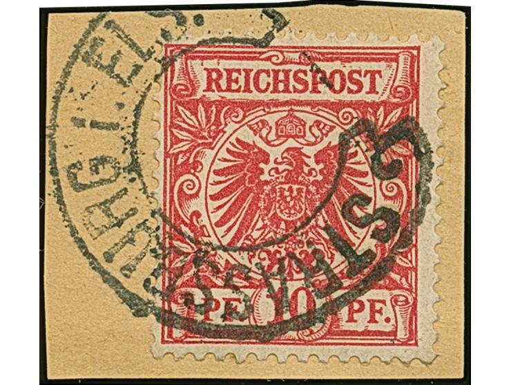 “STRASSBURG i. ELS. ”(Spalink 36-5MN) ohne Datum und Jahr sehr klar auf Krone/Adler 10 Pfg. karmin auf Briefstück in einwandfreier Erhaltung. Eine sehr seltene Innendienstverwendung, sonst nur auf Zeitungen vorkommend. Bisher sind nur ganz wenige Briefstücke mit Marken bekannt und ist mit praktisch komplettem Stempelabdruck eine große Hufeisenstempel-Seltenheit, Fotoattest Petry BPP (2010)