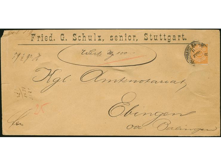 “STUTTGART K.W. POSTAMT I. 17.JUNI(93)" (Spalink 37-1M) ohne Zeigruppenriegel auf Württemberg 25 Pfg. dunkelorange als tarifgerechte Einzelfrankatur auf langformatigem Wertbrief über 100 M. nach Ebingen bei Balingen mit Ankunftsstempel. Die farbfrische Marke ist normal gezähnt mit zwei verkürzten Zähnen, der Umschlag ist oben etwas verkürzt, ansonsten in einwandfreier Erhaltung. Ein interessanter Brief mit diesem außerordentlich seltenen Hufeisenstempel, zum Zeitpunkt der Prüfung war es der erste bekannte frankierte Brief überhaupt, doppelt signiert Spalink BPP mit Fotoattest (1974)