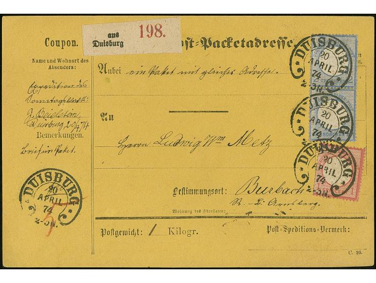 “DUISBURG 20.APRIL.74” (Spalink 10) mehrfach sehr klar auf großer Schild 1 Gr. karmin und senkrechtes Paar 2 Gr. grauultramarin als tarifgerechte Frankatur auf kompletter Paketkarte für ein 1 kg schweres Paket nach Burbach mit Ankunftsstempel. Die farbfrischen Marken sind gut geprägt und gut gezähnt. Die untere 2 Gr.-Marke mit einem verklebten Einriss, ansonsten in sehr guter Erhaltung. Eine sehr dekorative Verwendung, Fotoattest Brugger BPP (2008)