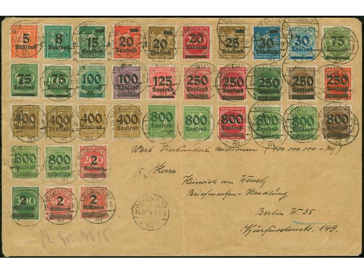 1923, Aufdruck-Ausgaben der Hochinflation komplett mit 36 verschiedenen Werten inkl. 800 Tausend auf 500 M. je mit Stempel “BERLIN W81 *b 15.10.23” auf überfrankiertem Wertbrief im Ortsverkehr mit Ankunftsstempel. Der Umschlag mit senkrechter Faltung und Randspuren, die Marken fast alle mit zentrischer Entwertung und bis auf ganz wenige Eckzahnbüge durchgehend in einwandfreier Erhaltung, Fotoattest Oechsner BPP (2010)
