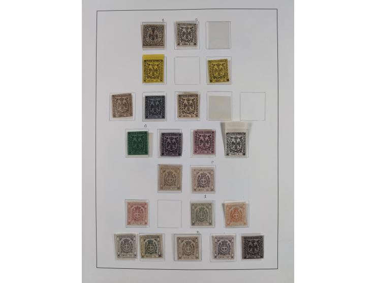 1852/60, Collection on eight album pages with good parts Papal States, Modena and Sicilia, only few reprints, mostly fine. Sicilia with good unused part, ½ gr. to 20 gr. denominations represented, though note a handful of multiples, with myriad shades for the specialist to further study. Many stamps signed G. Bühler, Raybaudi and Diena, some faulty or dubious examples to be expected, but good quality to what is often found, many four-margin examples among the imperforates, overall fresh and fine or better.