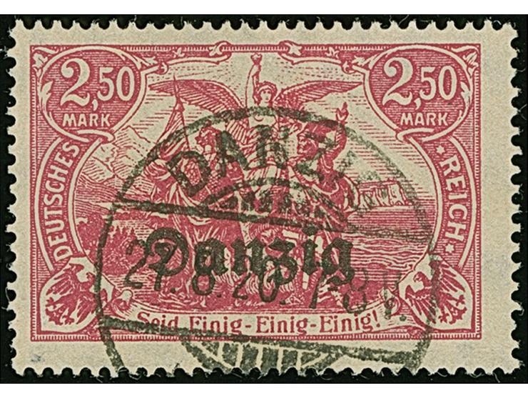 2.50 M. rosakarmin mit zeitgerechter Entwertung “DANZIG *1g 27.8.20”, in einwandfreier Erhaltung, signiert Kniep BBP und Infla Berlin und Fotoattest Gruber BPP (2025)