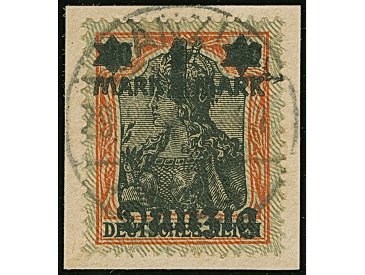 1 M. auf 30 Pfg. mit doppeltem Netzunterdruck, Spitzen nach oben, mit zeitgerechter Entwertung “DANZIG TA 29.8.20” auf Briefstück, in einwandfreier Erhaltung, sign. Schüler BPP, Kniep und Infla Berlin sowie Fotoattest Gruber BPP (2025)