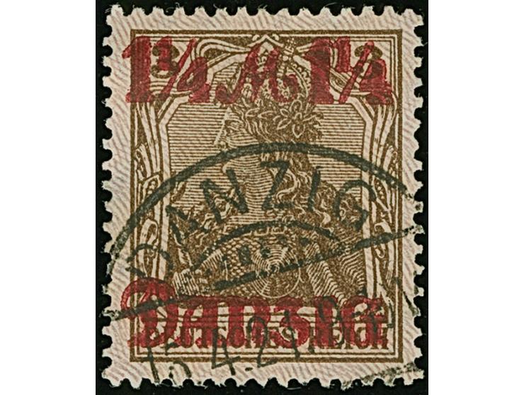 1¼ M. auf 3 Pfg. mit doppeltem Netzunterdruck, Spitzen nach unten, mit zeitgerechter Entwertung “DANZIG (*5e) 15.4.21”, in einwandfreier Erhaltung, sign. Schüler BPP und Fotoattest Gruber BPP (2025)
