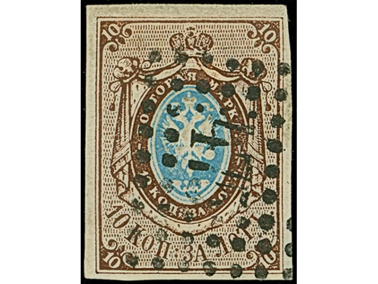 MORSHANSK: 10 kopeck brown & blue, good to large margins used by good strike of dotted rectangular “475”. Very fine. Signed Buchsbayew.