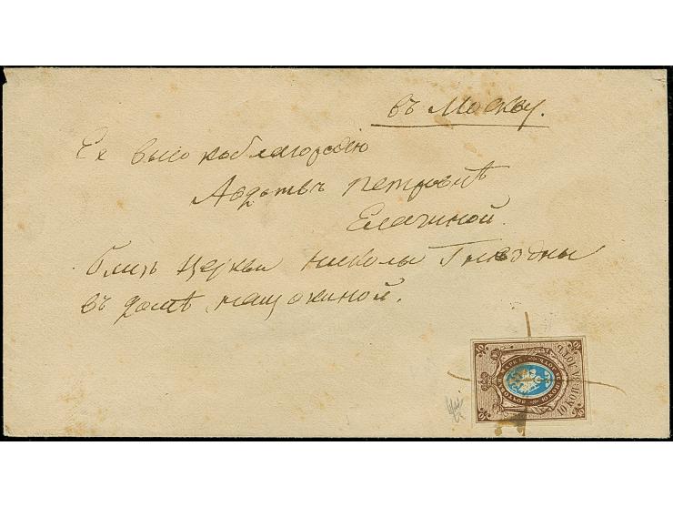10 kopeck brown & blue, good to large margins, tied by pen cross to envelope (one backflap notcomplete) to Moscow. The stamp with unobtrusive tear at right, still fine and attractive.Certificate Buchsbayew (2017)