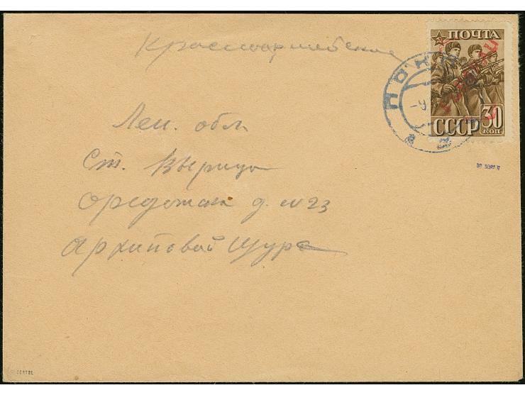 1941, 23 Jahre Rote Armee 30 K. mit rotem Handstempelaufdruck “PLESKAU”, sauber mit blauem Stempel “PSKOV -9 8 41” auf Briefkuvert, die Marke durch einige verkürzte Zähne, sonst in guter und attraktiver Erhaltung, sehr selten. Vor Ausgabe eigener Marken erhielten auf Anordnung alle Poststücke, die in Briefkästen vorgefunden wurden, vor der Beförderung den Handstempel in violet bzw. rot, sign. Dr. Schultz sowie Fotoattest Krischke (2009)