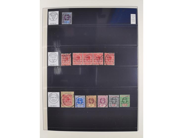 1915/16, ´TOGO / ANGLO-FRENCH / OCCUPATION´ Collection of cancellations on Gold Coast KGV overprinted issue up to 20 sh., including Anecho, Assahun, Lome Togogebiet, Noepe, Station Palime, Agbeluvhoe and Tsewie. Mostly fine, neatly housed on expertly described nine album pages.