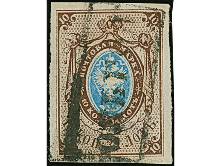 OLGOPOL (Ukraine): 10 kopeck brown & blue, large even margins, cancelled by complete and quite clear strike of pre-philatelic boxed handstamp. Very fine and rare. Signed Buchsbayew