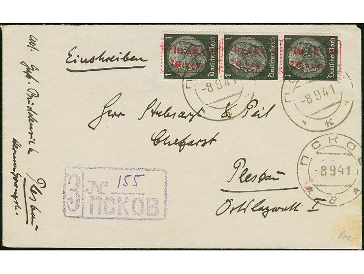 1941, 20 K. auf 1 Pfg., roter Handstempelaufdruck, senkrechter Dreierstreifen mit Stempel “PSKOV -8.9.41” auf Orts-R-Brief, tadellos, ein seltener Brief, sign. Dr. Rommerskirchen BPP sowie Fotoattest Brunel (2025)
