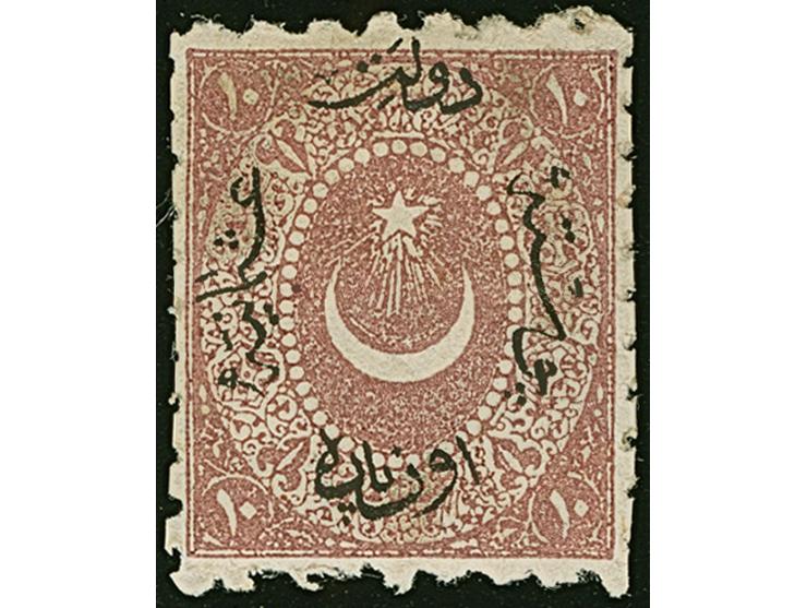 1871, Star & Crescent (Duloz), 10 pa. mauve, perf. 5-11, unused with original gum, heavy hinge remnants, very well centered for this issue and of superb deep and fresh colour,a fine and scarce stamp. (Isfila catal. value 6.800,-€)