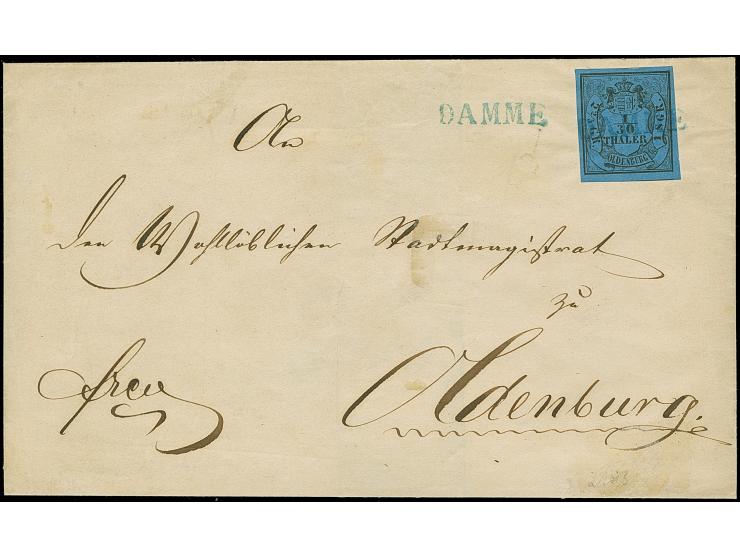 “DAMME” blauer L1 auf allseits breitrandiger 1/30 Th. auf blau in Type I auf Faltbriefhülle nach Oldenburg. Die farbfrische Marke ist in einwandfreier Erhaltung, die Briefhülle hat leichte Knitterspuren und ist rückseitig fehlerhaft