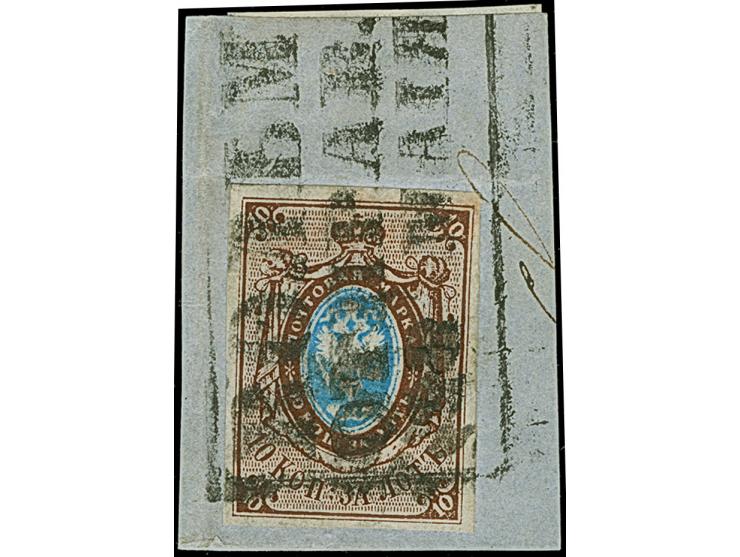 WOLMAR (Valmiera, Latvia): 10 kopeck brown & blue, good to large margins, neatly tied by large part of boxed "WOLMAR OTPRAVLENO" to piece. Very fine and rare. Signed Buchsbayew.