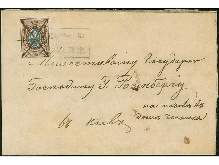 ZHITOMIR(Ukraine): 10 kopeck brown & blue, good to large margins, tied by pen star and boxed pre-philatelic " ZHITOMIR 28 (JANUARY 1858)" to almost entire letter (parts of outer flaps missing) to Kiev. Slightly cleaned, otherwise very fine. Very rare and attractive. Certificate Buchsbayew (2017)