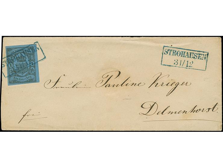 “STROHAUSEN 31.12.” blauer Rahmenstempel klar auf voll- bis breitrandiger 1 Gr. lebhaftgraublau auf Briefkuvert nach Delmenhorst mit Ankunftsstempel. Der Umschlag mit kleinen Randspuren, die farbfrische Marke ist in einwandfreier Erhaltung, signiert Stegmüller BPP