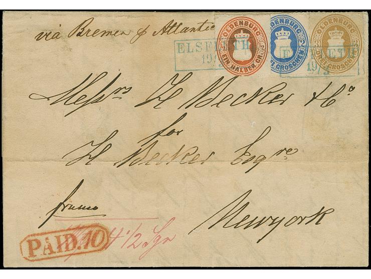 “ELSFLETH 19.3.(66)” blauer Rahmenstempel zweimal klar auf ½ Gr. rotorange, 2 Gr. blau und 3 Gr. braun als tarifgerechte Frankatur auf komplettem Faltbrief via Delmenhorst und Bremen mit rotem Ra1 “PAID.10” und Weiterfranko-Vermerk “Wfr. 4½ Sgr.” nach New York. Die 3 Gr.-Marke mit kleinen Fehlern durch Randklebung und der Faltbrief mit Patina, ansonsten in einwandfreier Erhaltung. Eine dekorative und seltene Buntfrankatur mit Destination USA, aus Elsfleth hat ProFi nur einen weiteren Brief aus dieser Korrespondenz registriert, Fotoattest Brettl BPP (1997)