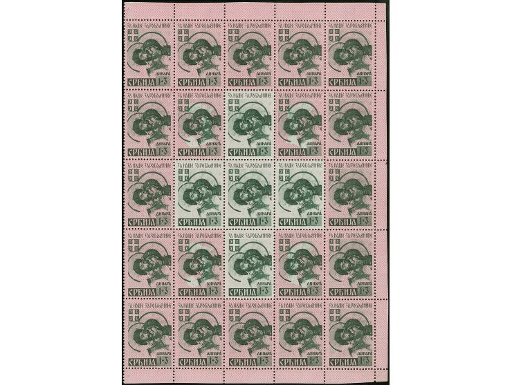 1941, Kriegsgefangene 1+3 D., rechte Hälfte des Schalterbogens, Netzüberdruck mit Spitzen nach unten, bei den vier Marken mit ausgespartem “Ǝ” bzw. “E”  im Netzüberdruck fehlt die rosarote Umrandung des stilisierten “S”, postfrisch, tadellos. Aus dem einzig bekannten Druckbogen, ein attraktives und spektakuläres Unikat, sign. Dr. Zydek sowie Fotoattest Brunel (2019)
