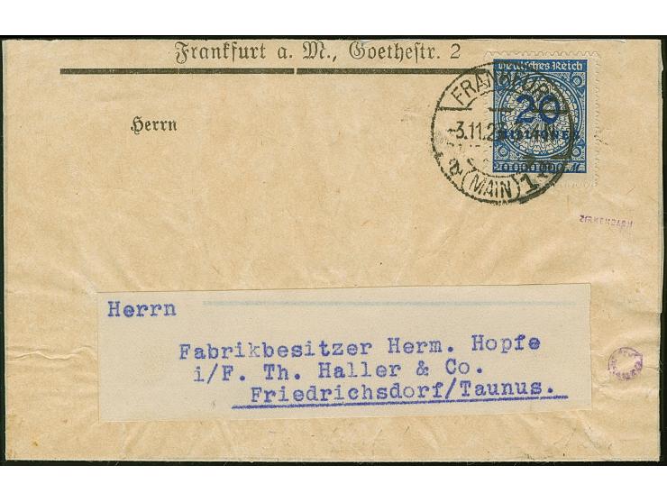Korbdeckel 20 Mio. M. durchstochen mit Stempel “FRANKFURT (MAIN) 3.11.23” als tarifgerechte Einzelfrankatur auf Drucksachen-Streifband nach Friedrichsdorf. Die Marke mit gutem Durchstich ist in einwandfreier Erhaltung, das Streifband ist rückseitig nicht ganz komplett. Eine der ganz seltenen Einzelfrankaturen, in dieser Form nur vom 1.11. bis zum 4.11.1923 möglich, sign. Zirkenbach und Infla Berlin