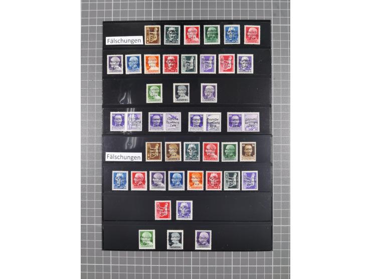1943, Fälschungssammlung, postfrisch sowie auf Blanko-Umschlägen, dabei 19 mal Mi.-Nr. 21-22 und 28,32 je auf Blanko-Umschlag mit falschem Stempel, die falsch gestempelten Werte oft mit echten Aufdrucken, sauber auf insgesamt 31 großen Steckkarten, dabei einige alte Diena Atteste