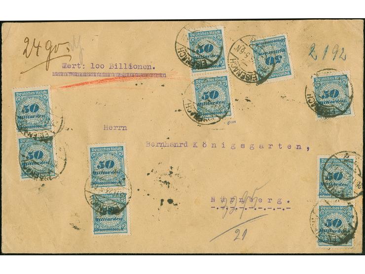 Korbdeckel 50 Mrd. M. gezähnt, vier senkrechte Paare und zwei Einzelmarken sowie senkrechtes Paar 20 Mrd. M. gezähnt, 5 Mrd. M. gezähnt, 2 Mrd. M. durchstochen und 1 Mrd. M. gezähnt je mit Stempel “EISENACH 26.11.23” als tarifgerechte Frankatur vorder- und rückseitig auf Wertbrief der 2. Gewichtsstufe mit Wertangabe “100 Billionen Mark” nach Nürnberg. Auf der Vorderseite hat der Rotstift das Papier zum Teil durchbrochen und wenige Marken haben kleine Eckzahn bzw. Eckfehler, ansonsten in guter Gesamterhaltung. Ein interessanter Wertbrief mit 10 Werten der 50 Mrd. M. gezähnt vom Ersttag der Portoperiode, Fotoattest Oechsner BPP (2011)