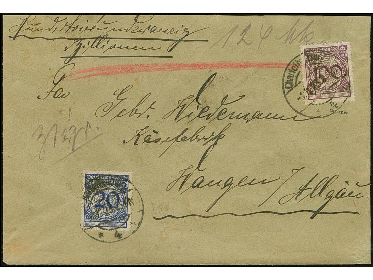 Rentenpfennig 20 und 100 Pfg. mit Ersttagsstempel “Charlottenburg 1.12.23” als tarifgerechte Frankatur auf Wertbrief der 2. Gewichtsstufe mit Wertangabe “124 Billionen Mark” nach Wangen mit Ankunftsstempel. Der Umschlag ist oben etwas verkürzt und die 100 Pfg.-Marke mit Knitterspuren vom Aufkleben, ansonsten in guter Erhaltung. Die 100 Pfg.-Wertstufe auf Brief vom ERSTTAG ist außerordentlich selten, ProFi hat keinen weiteren Ersttagsbrief registriert, signiert Infla Berlin und Gaedicke BPP