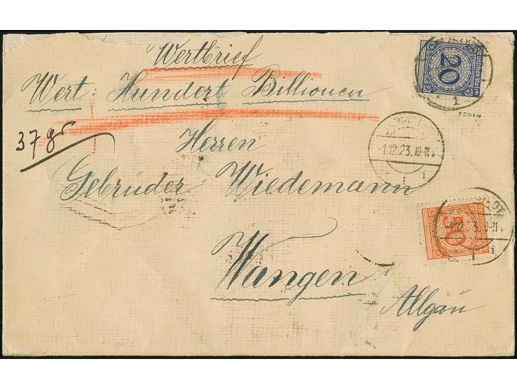 Rentenpfennig 20 und 50 Pfg. jeweils mit Ersttagsstempel “DARMSTADT 1.12.23” als tarifgerechte Frankatur auf Wertbrief der 2. Gewichtsstufe mit Wertangabe “100 Billionen Mark” nach Wangen mit Ankunftsstempel. Der Umschlag oben mit Öffnungsfehler und etwas verkürzt, ansonsten in guter Erhaltung. Mit der 50 Pfg.-Wertstufe sind Brief vom ERSTTAG selten, sign. Infla Berlin und Gaedicke BPP