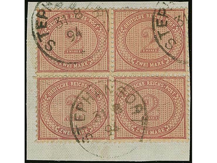 1890, 2 M. dunkelrotkarmin im angetrennten Viererblock mit Stempel “STEPHANSORT 31.8.94” auf Briefstück. Die linke untere Marke mit Einriss und wie die rechte untere Marke mit Randkerben, die beiden oberen Marken sind in einwandfreier Erhaltung. Trotz der Einschränkungen ein nicht häufiger Viererblock, sign. Bothe BPP