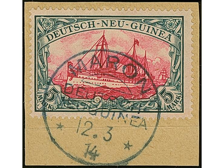 “MARON DNG 12.3.14” sehr klar auf Kaiseryacht 5 M. auf Briefstück. Die Marke ist in einwandfreier Erhaltung, das Briefstück unterhalb der Marke mit waagerechter Faltung