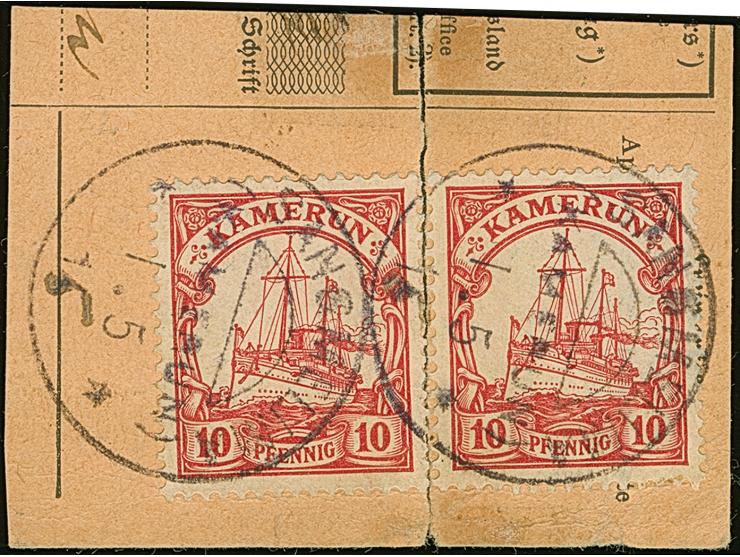 “SANGMELIMA (KAMERUN) 1.15.15” (Jahreszahl handschriftlich geändert von 14 in 15), zweimal klar auf zwei Marken Kaiseryacht 10 Pfg. mit Wasserzeichen auf ehemals komplettem, nun getrennten Postanweisungs-Briefstück mit rückseitigem Stempel “AMBAM (KAMERUN) 15.5.15” (zwei Ziffern handschriftlich in 5 geändert). Trotz der Trennung ein interessantes Briefstück mit besseren Stempeln