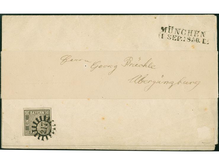 1 Kr. schwarz, Platte II, farbfrisch und allseits breitrandig, teils mit Zwischenlinien, mit sauber aufgesetztem gMR "217" und nebengesetztem L2 "MÜNCHEN 1 SEP. 1850" auf äußerem Drucksachen-Bogen mit nachempfundener Adressschleife. Schöne Erhaltung. Marke tadellos. Signiert Pfenninger und Attest Brettl BPP (1979)