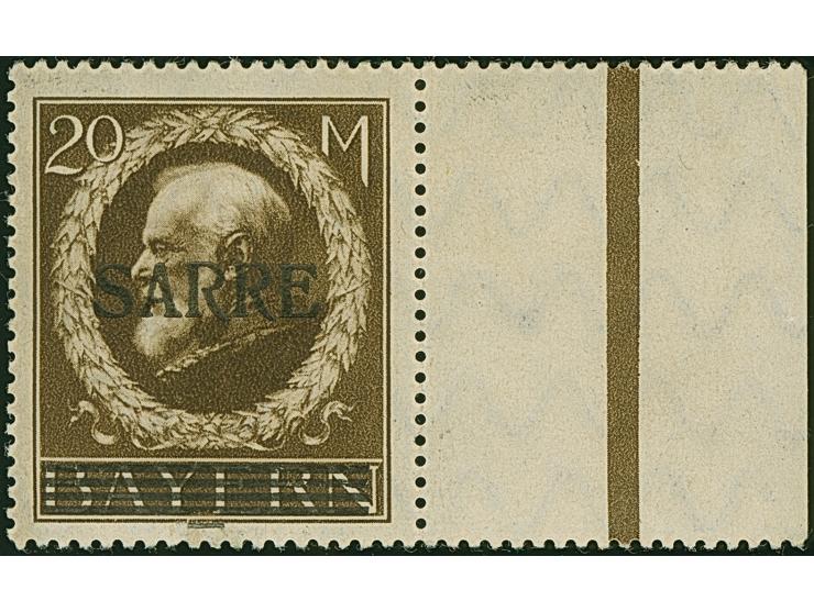 1920, Ludwig 20 Mark mit Aufdruck “SARRE”, rechtes Randstück von Aufdruckfeld 8, farbfrisch und meist gut gezähnt, sauber ungebraucht, unten winzig ergänzt, sonst in tadelloser Erhaltung. Eine der großen Seltenheiten der deutschen Philatelie; von den ehemals 16 überdruckten Marken sind heute noch 15 Stück registriert, eines gilt seit dem 2. Weltkrieg als verschollen. Signiert Dr. Dub sowie Burger BPP mit Fotoattest (1979)