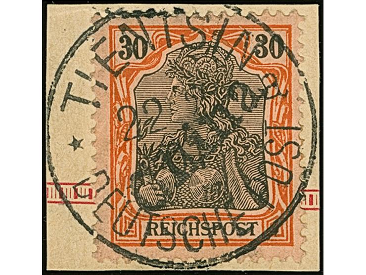 1900, Handstempel 30 Pfg. mit klarem Stempel “TIENTSIN DP *a 22.2.01” auf Briefstück. Die farbfrische Marke ist zum Teil üblich gezähnt und in einwandfreier Erhaltung. Ein außergewöhnlich schönes Exemplar dieser seltenen Marke, sign. Bothe BPP und Fotoattest Jäschke-L. BPP (2008)