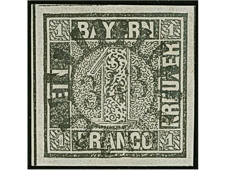 1849, 1 Kr. grauschwarz, Platte 1, farbfrisch und allseits breitrandig mit links voller, oben und rechts teilweiser Schnittlinie, zentrisch und klar mit gMR “343” (Teisendorf) entwertet, in tadelloser Erhaltung. Ein schönes Exemplar, sign. Pfenninger und Fotoattest Brettl BPP (2004)