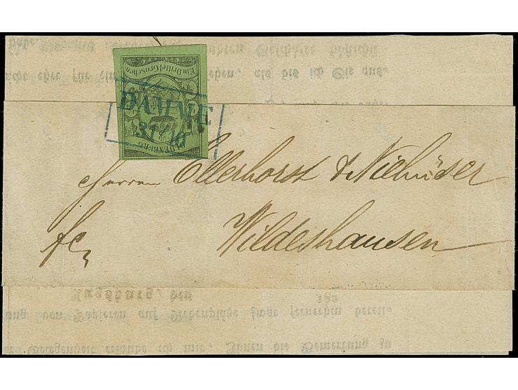 ⅓ Gr. auf grünoliv, farbfrisch, oben vollrandig, sonst dreiseitig sehr breitrandig im Schnitt mit klarem, blauen Rahmenstempel “DAMME 31.10.” auf Drucksachen-Streifband (gedruckter Inhalt nicht original dazugehörig) nach Wildeshausen. Das Streifband wurde gereinigt und ein kleines Loch rechts unterhalb der Marke geschlossen, die Marke ist in einwandfreier Erhaltung. Eine dekorative und seltene Einzelfrankatur, Fotoattest Brettl BPP (1993)