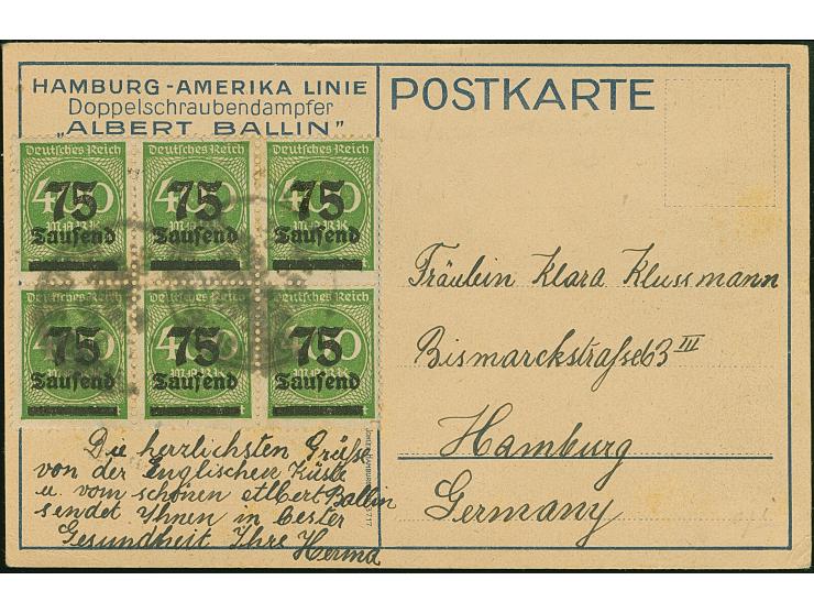 “DSP LINIE HAMBURG-NEW YORK 28.9.23” (D. Albedrt Ballin) zweimal etwas undeutlich auf waagerechtem 6er-Block 75 T. auf 400 M. auf Schiffspostkarte mit Text nach Hamburg. Zum Teil leicht fleckig, ansonsten in guter Erhaltung