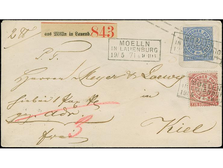 Aufbrauch-Umschlag 2 Gr. auf Preußen 2 Gr. Kleinformat, mit Zufrankatur 1 Gr. gezähnt, als Paketbegleitbrief von "MÖLLN IN LAUENBURG 19/5 71", nach Kiel.