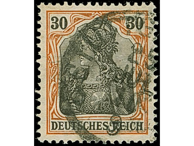 1905, Germania 30 Pfg. dunkelrötlichorange/schwarz auf mittelchromgelbem Papier mit liegendem Wasserzeichen (Wz. 1Y), sauber mit EKr. “STUTTGART 25.JUL.10” entwertet und in tadelloser Erhaltung. Bisher ist neben einem in der Literatur erwähnten Stück nur ein weiteres Exemplar registriert. Eine der ganz großen Germania-Seltenheiten, Fotoattest Jäschke BPP (1991) und Jäschke-L. BPP (2018)