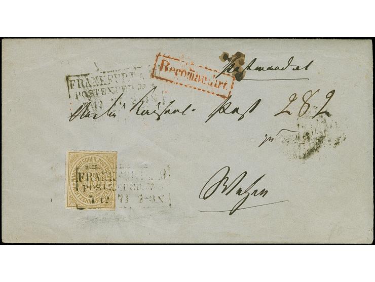 18 Kr. ockerbraun, recht farbfrisch und gut durchstochen, mit Ra2 "Frankfurt A. M. Postexped.No.2 7 12 71" auf eingeschriebenem Briefkuvert, als "Postmandat" nach Wehen, mit Ankunftsstempel. Im Kuvert leichte senkrechte Faltung, sonst einwandfrei. Postmandate wurden erst am 15.10.1871 eingeführt; die Gebühr betrug (incl. Porto und Reco-Gebühr) ohne Berücksichtigung des Betrages 5 Groschen bzw. 18 Kreuzer. Eine große Seltenheit; PROFI hat nur 5 Postmandate des NDP registriert, mit dieser Frankatur Unikat. Fotoattest Mehlmann BPP (2007)