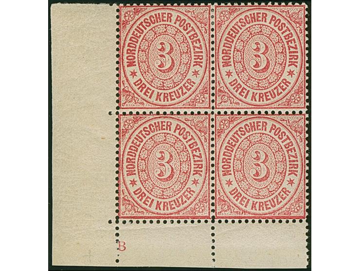 3 Kr. rosa im Viererblock aus der linken unteren Bogenecke mit Plattenkennzeichen "B", ungebraucht, das untere Paar postfrisch.