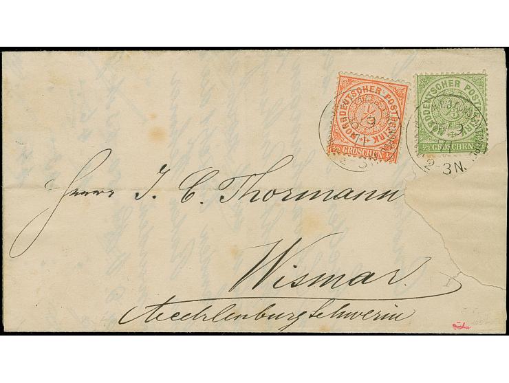 ⅓ Gr. grün und ½ Gr. orange, farbfrisch und gut gezähnt, mit jeweils sauber aufgesetztem EKr. "CONSTANTINOPEL N. P. A. 26/9 71" auf kompletter Drucksache nach Wismar, mit rückseitigen Bahnpost- und Ausgabestempeln. Im Briefpapier vorderseitig Fehlstelle (hinterlegt), sonst einwandfreie und schöne Erhaltung. Ein außerordentlich seltenes Stück. Signiert Drahn.