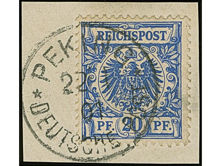Krone/Adler 20 Pfg. mit klarem EKr. “PEKING DP 22.1.01” auf Briefstück. Die farbfrische Marke ist gut gezähnt und in einwandfreier Erhaltung, sign. Dr. Lantelme