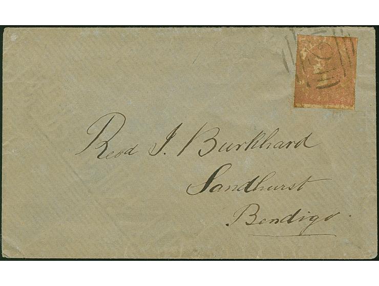 1858, Emblems Issue 4 d. pale dull rose on smooth vertically laid paper, over-inked print, rouletted 5½-6½, tied to 1858 entire letter from Geelong to Bendigo by circular "2" numeral obliterator in black, 'Geelong/ Crown / Victoria' datestamp on reverse (JU/25), transit marks Sandhurtst and Melbourne. Tiny toned and light border crease, otherwise fine and scarce cancellations.