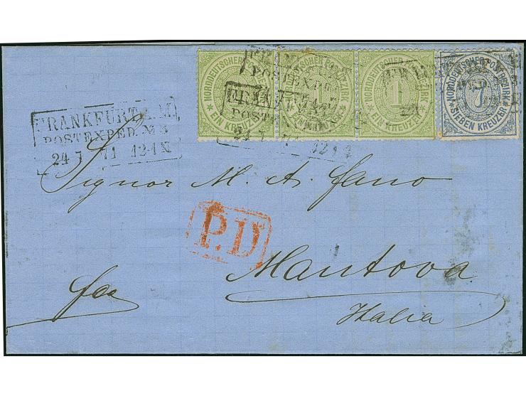 1Kr. Im waagerechten 3er-Streifen, mit 7 Kr. graublau, mit Ra3 "FRANKFURT A.M.POST-EXPED.No.5  24 7 71"auf Briefhülle nach Mantua, Italien. 7Kr. Minimale Altersfleckchen. Eine attraktive und ungewöhnliche Farbfrankatur.