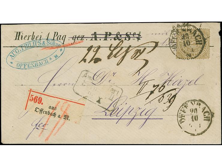 18 Kr. ocker, mit rechts sauber auf- und nebengesetztem EKr. "OFFENBACH 20 10" (1871) auf teils vorgedrucktem Paketbegleitbrief nach Leipzig, mit Ausgabestempel. Die Marke ist farbfrisch, sie war gelöst und ist unten unauffällig nachgezähnt. Ein attraktiver und außerordentlich seltener Brief; PROFI hat nur 3 weitere Einzelfrankaturen dieser Marke registriert. Attest Flemming (1986 als einwandfrei) und Fotoattest Spalink BPP (1990)