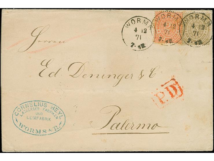 18 Kr.ockerbraun (minimal gummifleckig) und 2 Kr.orange, mit K1 EKr. “WORMS 4.12.71” auf Brief der 2.Gewichtsstufe nach Palermo. Eine außerordentlich seltene Frankatur der beiden besten Kreuzermarken des Gebietes. Fotoattest Mehlmann BPP.