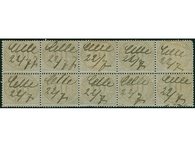 10 Gr. gelbbraun, waagerechter Zehnerblock mit handschriftlicher Entwertung "Celle 22/7 71", bis auf eine runde Ecke an der rechten oberen Marke gut gezähnt, farbfrisch und einwandfrei. Größte bei Profi registrierte gebrauchte Einheit dieser Marke.